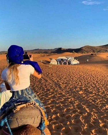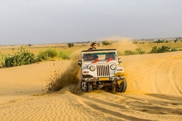 Day 2: Morning sightseeing: Bada Bagh, Kuldhara (abandoned village) or local villages → Afternoon to the desert (Sam Sand Dunes) → Camel ride/jeep safari at sunset → Overnight in a desert camp with dinner + folk music.